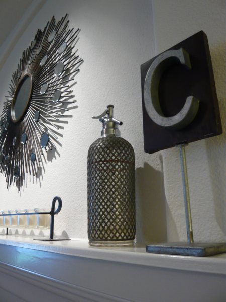 I am all about the balance of masculine and feminine design sensibilities, so I think this vintage seltzer bottle from the 50s and strong “C” typeset letter from Anthropologie round out the fireplace vignette perfectly.