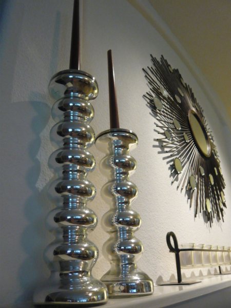 My design style is more masculine in a sense. I prefer darker palettes and am not one for over-the-top girly details, but I always have to add a touch of glamour to every room. In our family room, a pair of mercury glass candlesticks and a starburst mirror do the trick!