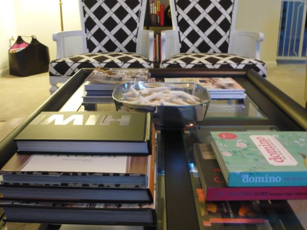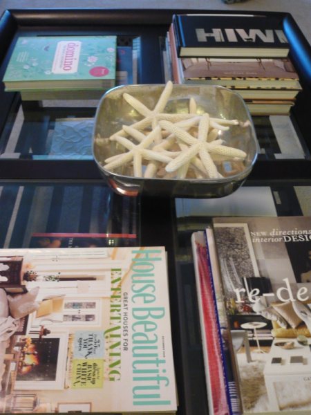My coffee table is stacked with interior design books and magazines. Although I love my bowl of starfish, I usually have to put it up on a bookshelf because my puppy, Tate seems to think that it is a bowl full of treats. I took these pictures a little while back and there are even more books now!